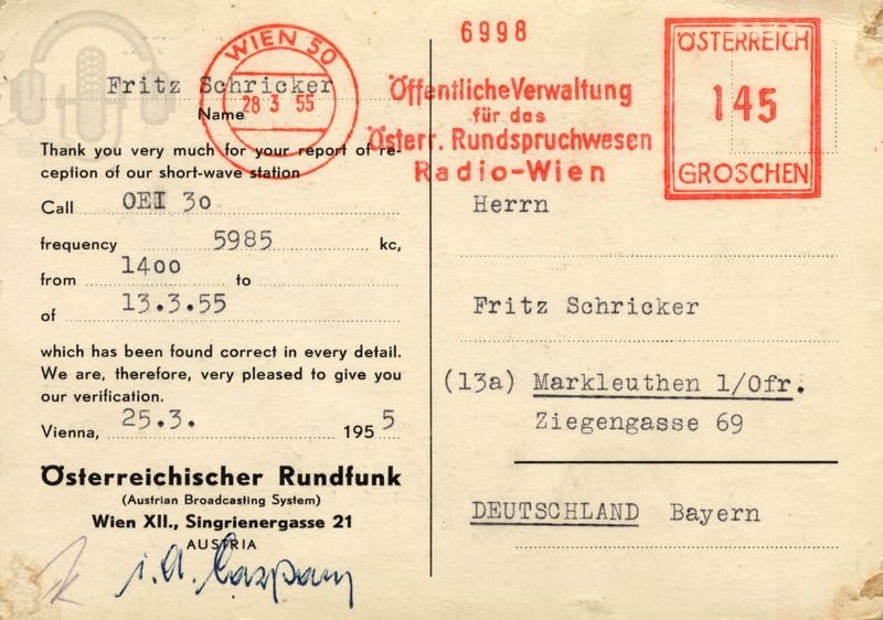 Land: AUT, Austria Gruppe: national Bezeichnung: OR Station: Österreichischer Rundfunk QSL Datum: 1955-03-13 Beschreibung: Bildkarte; Hochformat, Logo ÖR, rot-weiß-roter Streifen mit Schriftzug *q*Österreichischer Rundfunk Kommentar: *p*Fritz Schricker; *f*5985; *l*D; *tx*OEI30