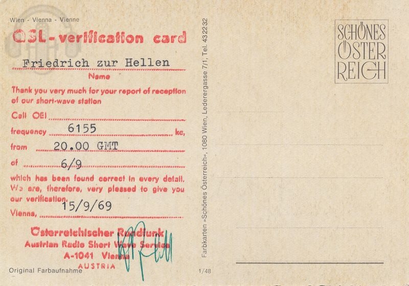 Land: AUT, Austria Gruppe: international Bezeichnung: ROI Station: Österreichischer Rundfunk, Austrian Radio Short Wav QSL Datum: 1959-09-15 Beschreibung: Postkarte mit rückseitigem Stempelaufdruck; Rathaus, Burgtheater und Westbahnhof Wien - Beispiel für zahlreiche damals verwendete Postkarten Kommentar: *p*Friedrich zur Hellen; *f*6155; *l*D