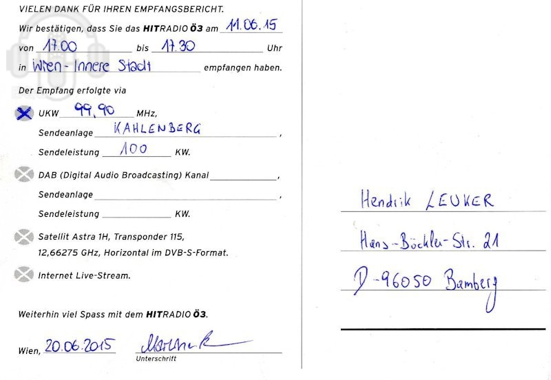 Land: AUT, Austria Gruppe: national Bezeichnung: ORF Station: Österreich 3 QSL Datum: 2011-06-15 Beschreibung: Bildkarte; *q*Hitradio Ö3 Kommentar: *p*Hendrik Leuker; *f*99.9; *s*Wien-Kahlenberg
