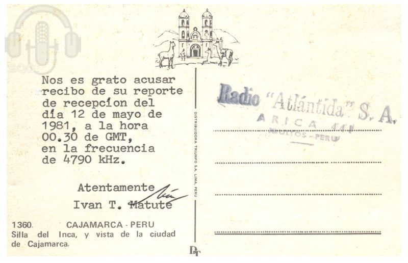 Land: PRU, Peru Gruppe: international Bezeichnung: RATLA Station: Radio Atlántida QSL Datum: 1981-05-12 Beschreibung: Postkarte; *q*Silla del Inca, y vista de la ciudad de Cajamarca Kommentar: *p*o.A.; *f*4790; *l*S