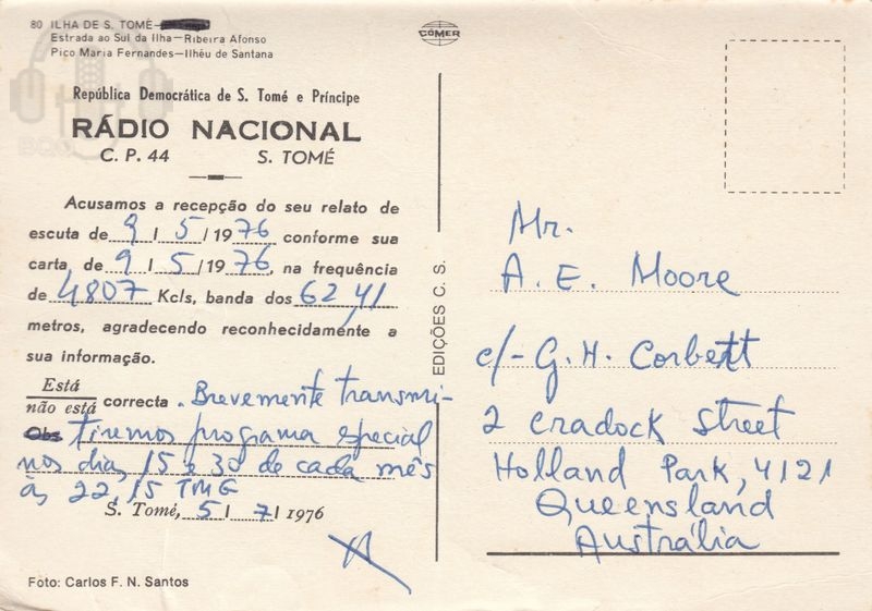 Land: STP, Sao Tome and Principe (Democratic Republic of) Gruppe: national Bezeichnung: RNSTP Station: Radio Nacional Sao Tomé è Principe QSL Datum: 1976-05-09 Beschreibung: Ansichtskarte; 4 Inselansichten - Pico Fernandez und Strasse im Süden und Strandszenen Kommentar: *p*A.E.Moore; *f*4807; *l*E