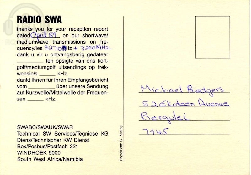 Land: NMB, Namibia (Republic of) Gruppe: international Bezeichnung: SWA Station: Radio RSA QSL Datum: 1989-04-99 Beschreibung: Ansichtskarte; Serie SWAUK, SWABC (01/03); Wüste Kommentar: *p*Michael Rodgers; *f*3270